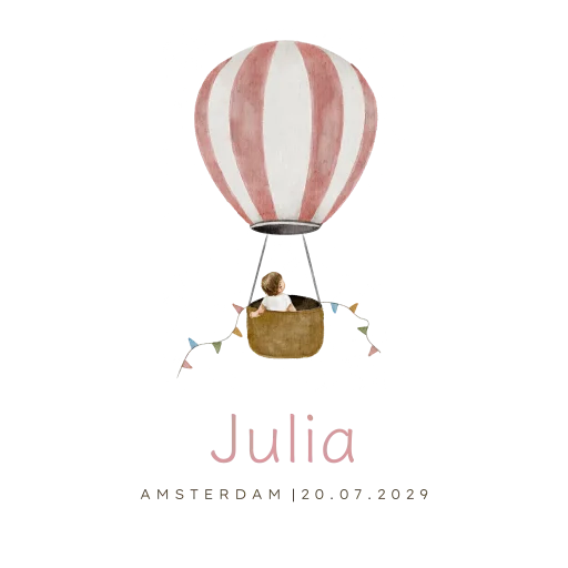 Geboorte tegeltje met een illustratie van een roze luchtballon. Daar staat de naam op, en de geboorteplaats en geboortedatum. Lief tegeltje voor de babykamer, ook om cadeau te geven!