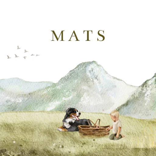 Het tegeltje is voorzien van een lieve illustratie van aquarel getekende bergen, een hond en een broertje in het gras met veldbloemen.