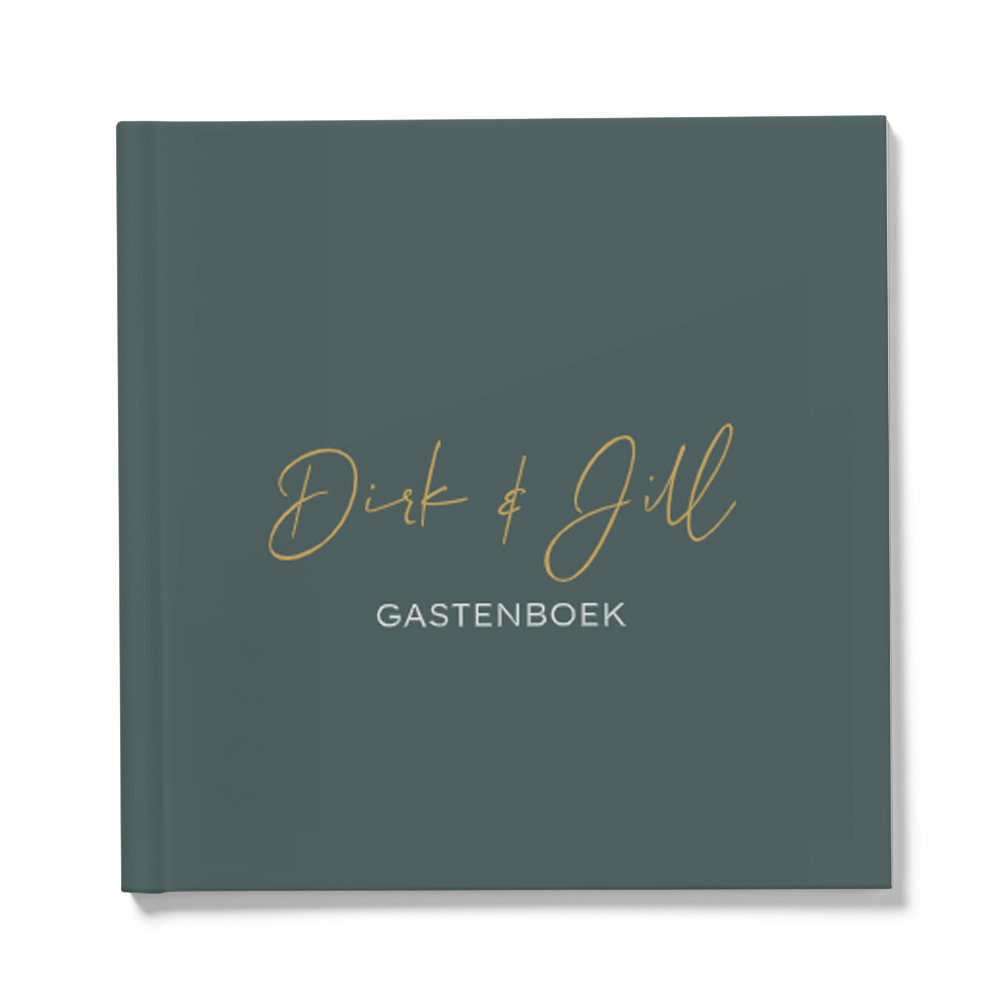Minimalistisch vierkant gastenboek voor een bruiloft met jullie namen, de achtergrond heeft een mooie donkergroene kleur. De buitenkant van het boek kan je zelf bewerken en personaliseren. De binnenkant heeft witte bladen, hier kunnen de gasten een wens opschrijven.