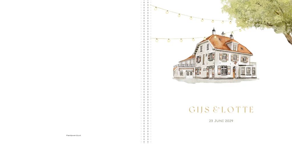 Leuk vierkant gastenboek voor een bruiloft met een getekende illustraties van een trouwlocatie, de duikenburg. Wij kunnen alle locaties tekenen, stuur ons een bericht mocht je jouw trouwlocatie op je gastenboek of trouwkaart willen. De buitenkant van het boek kan je zelf bewerken en personaliseren. De binnenkant heeft witte bladen, hier kunnen de gasten een wens opschrijven.