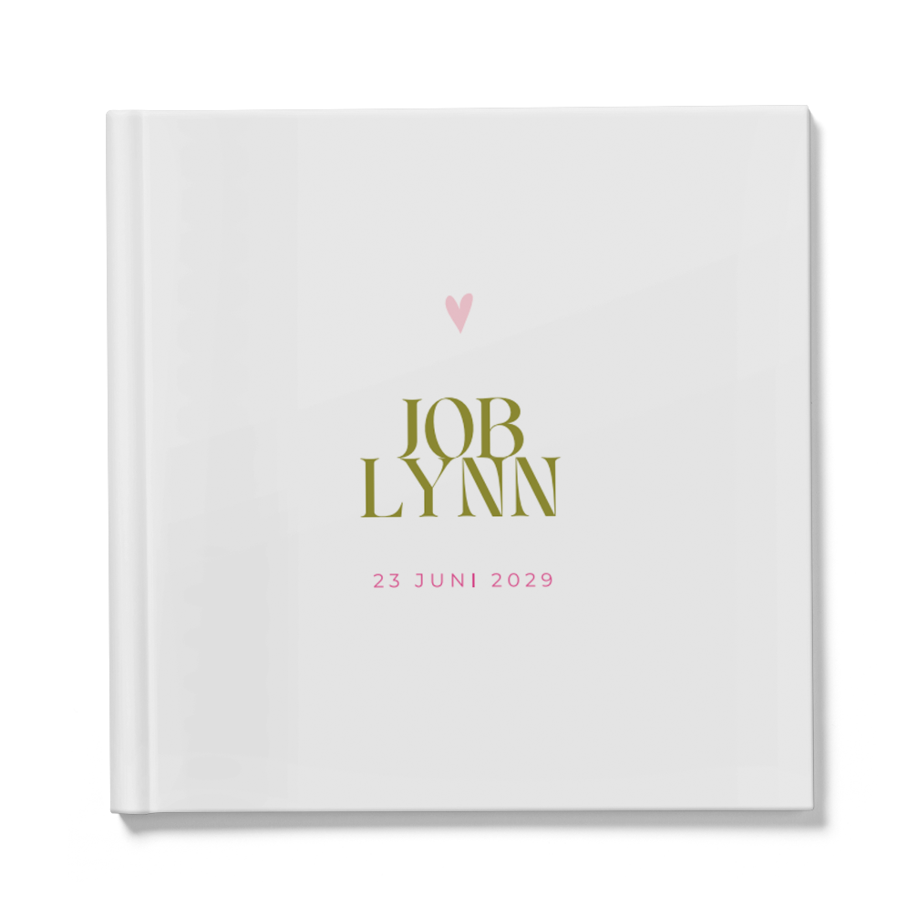 Hip gastenboek voor jullie bruiloft met jullie namen in een mooie groene kleur met roze details. De buitenkant van het boek kan je zelf bewerken en personaliseren. De binnenkant heeft witte bladen, hier kunnen de gasten een wens opschrijven.