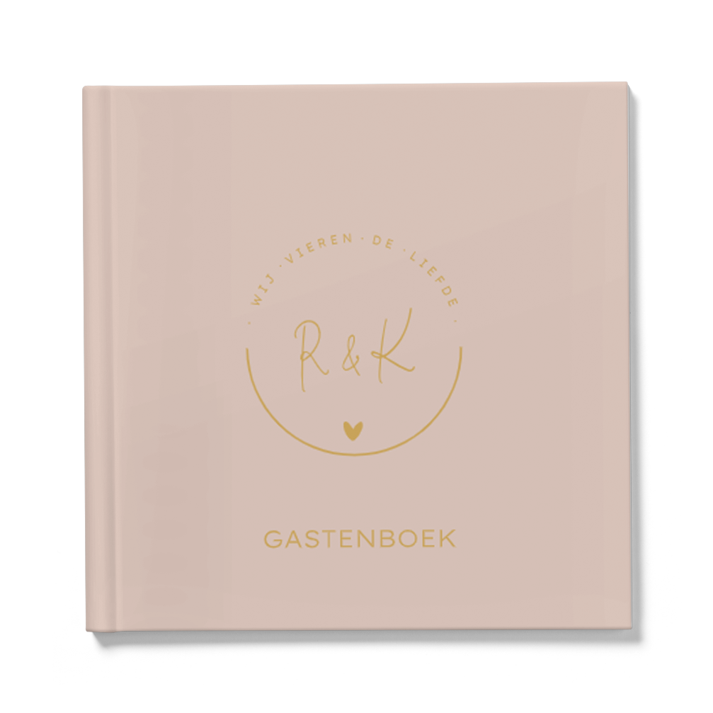 Oudroze vierkant gastenboek voor een bruiloft met een logo met jullie initialen en mooie roze achtergrond kleur. De buitenkant van het boek kan je zelf bewerken en personaliseren. De binnenkant heeft witte bladen, hier kunnen de gasten een wens opschrijven.