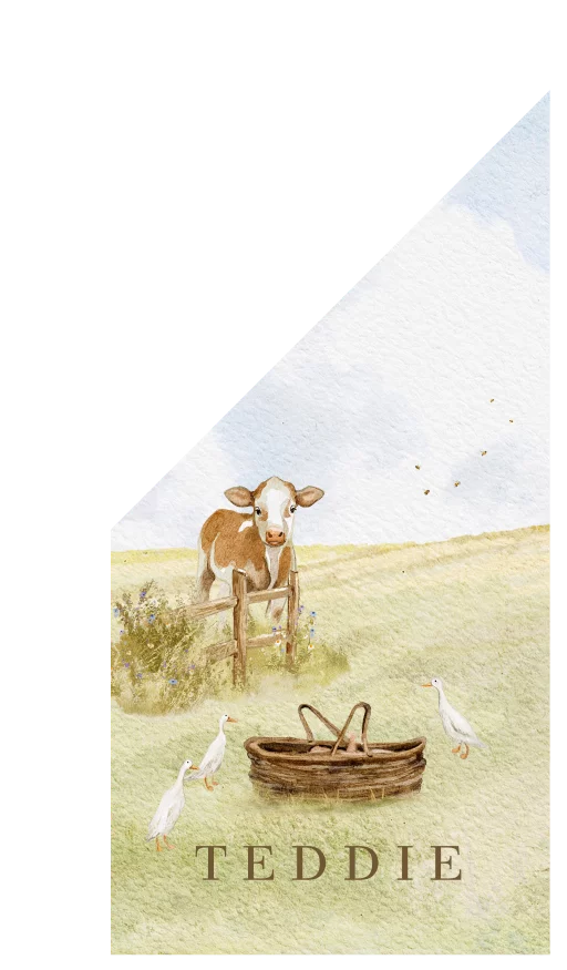 Geef de geboorte van je kindje een extra feestelijk tintje met een gepersonaliseerde geboortevlag! Ontwerp je eigen vlag met unieke, handgetekende illustraties die perfect passen bij de stijl en persoonlijkheid van jouw gezin. Deze geboortevlag heeft illustraties van een koe in een wei met een baby in een mandje en loopeenden. Met deze vlag ziet de hele buurt dat er bij jullie een kleintje is geboren. Leuk als jullie op een boerderij wonen.
