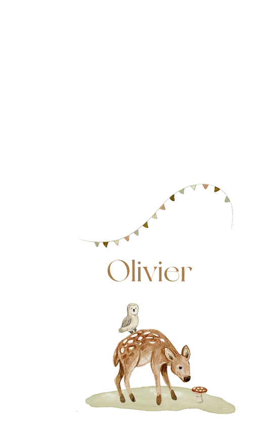 Geef de geboorte van je kindje een extra feestelijk tintje met een gepersonaliseerde geboortevlag! Ontwerp je eigen vlag met unieke, handgetekende illustraties die perfect passen bij de stijl en persoonlijkheid van jouw gezin. Deze geboortevlag heeft illustraties van van een hertje met een uil op zijn rug en vrolijke vlaggen. Met deze vlag ziet de hele buurt dat er bij jullie een kleintje is geboren.