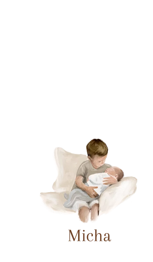 Unieke geboortevlag met een mooie illustratie van een grote broer op een bank met een baby broertje.Unieke geschilderde illustratie die we ook kunnen vervangen door een zus met een baby of een jongetje met een andere haarkleur. Vraag gerust even om hulp.