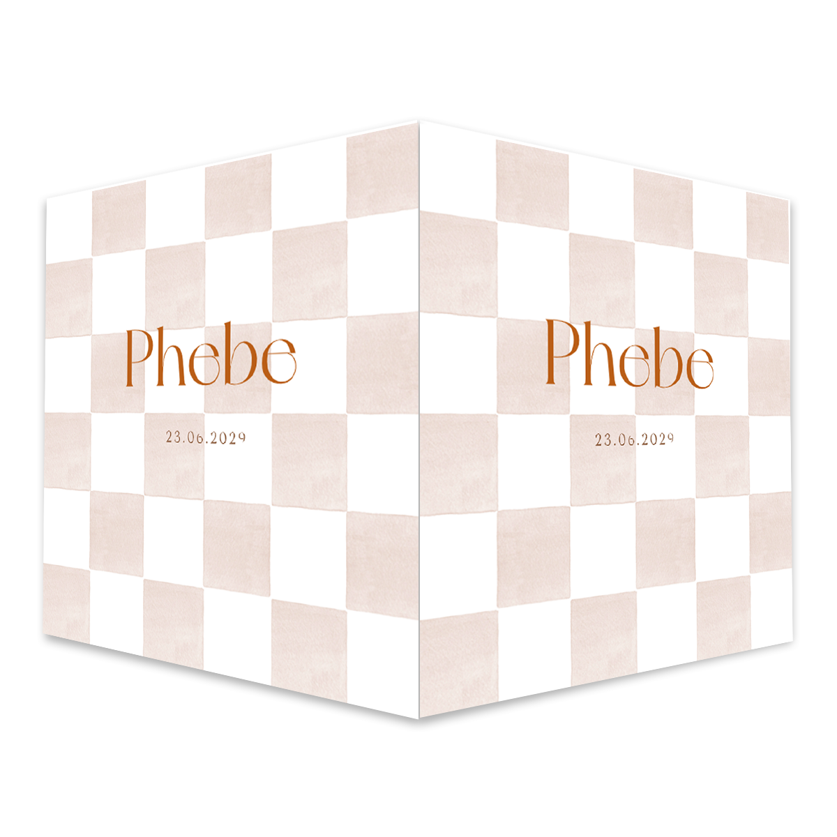 dubbel Vierkant dubbel raambord met zacht zalmroze blokjespatroon — weerbestendig. Stevige afwerking, ideaal als geboortebord of raamdecoratie voor een meisje. Personaliseer eenvoudig met naam en geboortedatum.