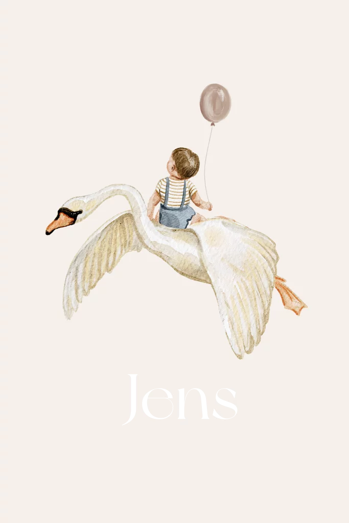 Voeg een dromerige sfeer toe aan je interieur met deze mooie poster van een zwaan met een jongen en een ballon. De zachte kleuren en rustige uitstraling maken het een perfecte decoratie voor de kinderkamer of andere ruimtes in je huis. Bijpassend bij het geboortekaartje in deze stijl.