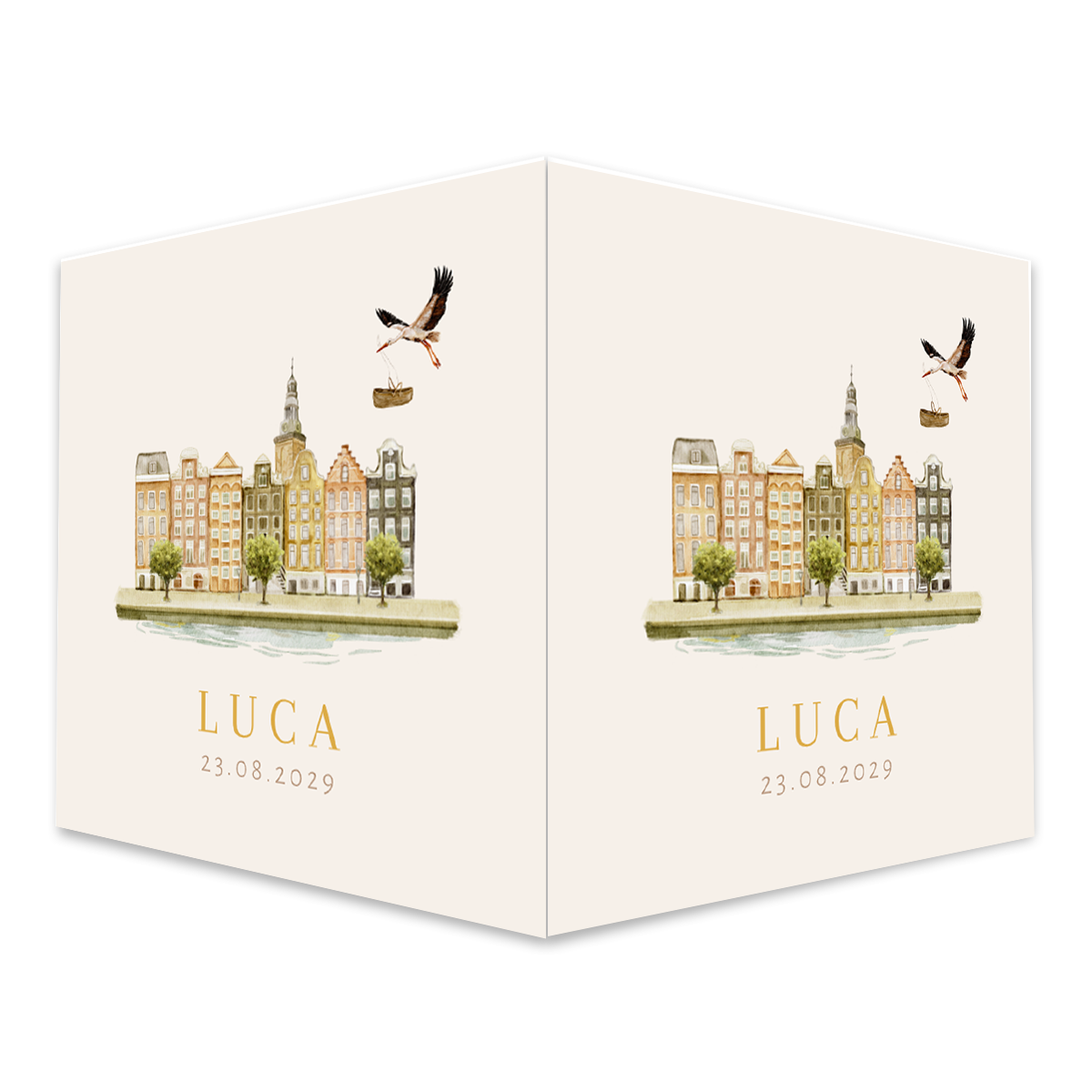 Dit raambord laat je hele buurt genieten van de geboorte van jullie kindje. Dit bord met een mooie illustratie van grachtenpandjes in Amsterdam is met zorg ontworpen en met de hand geschilderd in waterverf, wat het een warme, persoonlijke uitstraling geeft. Je kunt dit bord zelf bewerken en aanpassen. Materiaal: Kanaalplaat | Formaat 50x50 cm | Weerbestendig | 3,5mm dik