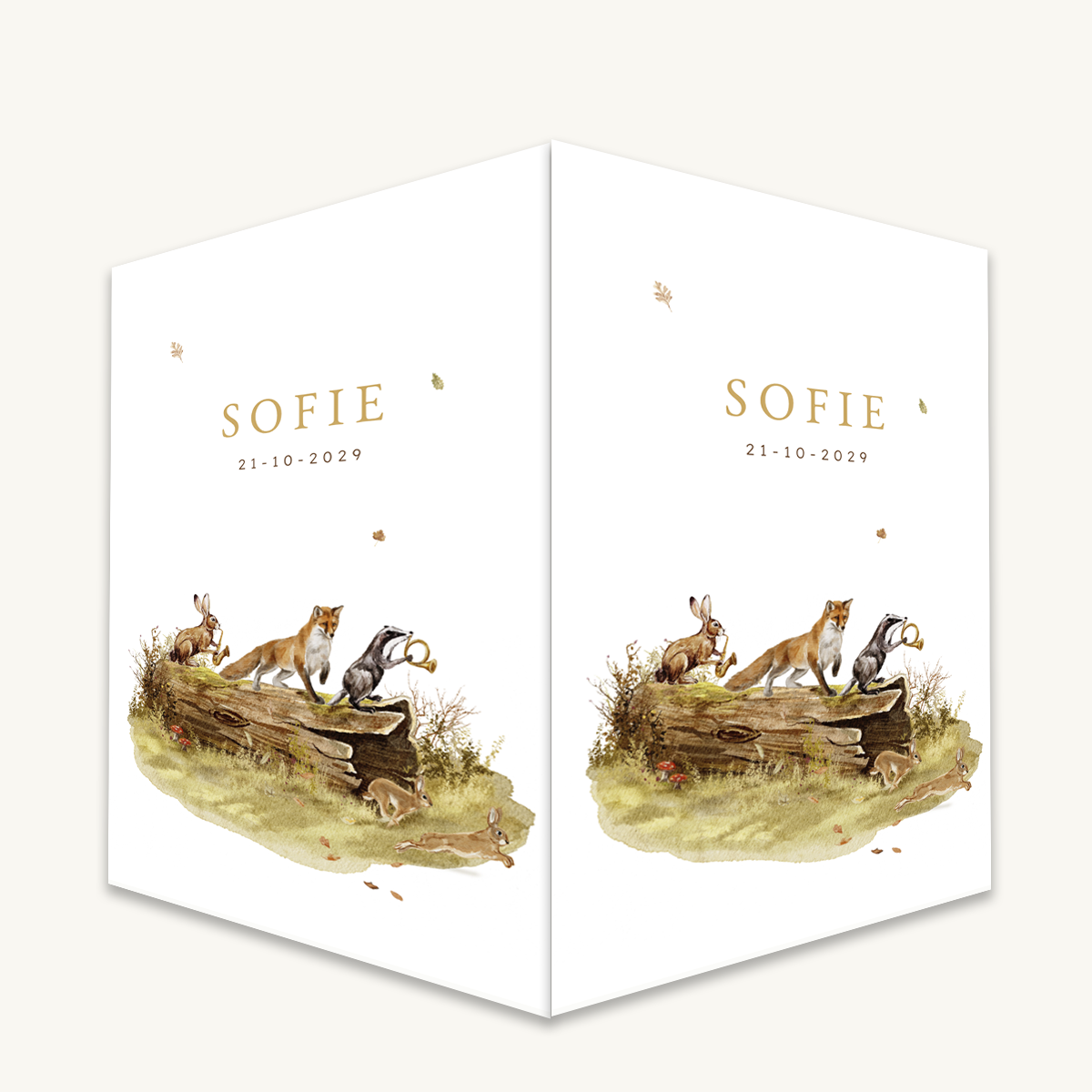 Dit raambord laat je hele buurt genieten van de geboorte van jullie kindje. Een raambord met illustratie van een boomstam, een haas, vos en een das. Materiaal: Kanaalplaat | Formaat 40x60 cm | Weerbestendig | 3,5mm dik