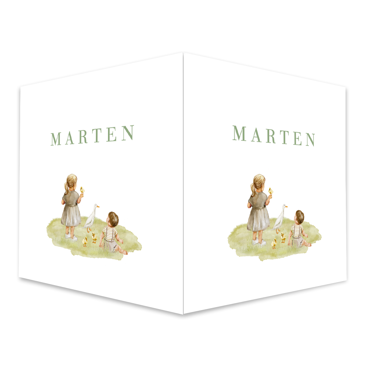 Raambord dubbel met een broertje, zijn grote zus en eendjes in een lentetuin. Dit vrolijke ontwerp is perfect voor het verwelkomen van een broertje. Voeg een speelse, lenteachtige sfeer toe aan je raam met dit raambord!