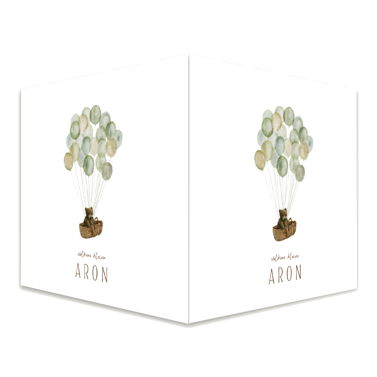 Dubbel raambord of makelaarsbord met een beertje in een mand en groene ballonnen. Je kunt dit geboortebord zelf bewerken.