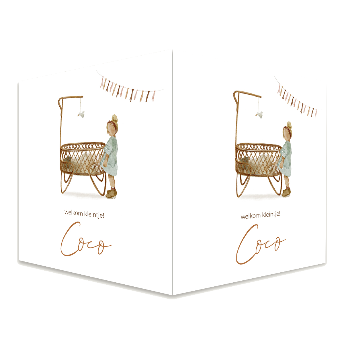 Raambord om de geboorte van jullie kleintje ook in de buurt bekend te maken. Dit dubbele raambord plak je op het raam. Je kunt het bord zelf bewerken en aanpassen. Op het geboortebord staat een ouder zusje bij een wieg