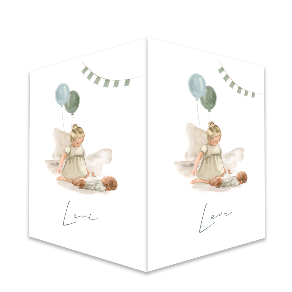 Raambord om de geboorte van jullie kindje ook aan de buurt bekend te maken. Dit dubbele geschilderde raambord heeft een mooie olieverf illustratie met een grote zus en een baby met twee ballonnen in het blauw en groen. Materiaal: Kanaalplaat | Formaat 40x60 cm | Weerbestendig | 3,5mm dik