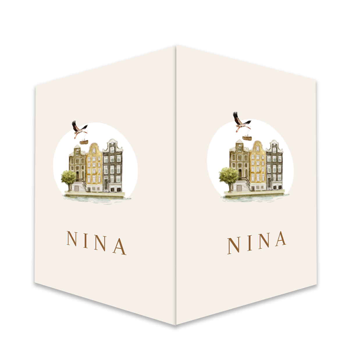 Prachtig dubbel raambord met grachtenpandjes van Amsterdam en een vliegende ooievaar. Je kunt het raambord zelf bewerken en aanpassen. Uniek geboortebord om de hele buurt te laten weten dat er een baby is geboren. Materiaal: Kanaalplaat | Formaat 40x60 cm | Weerbestendig | 3,5mm dik