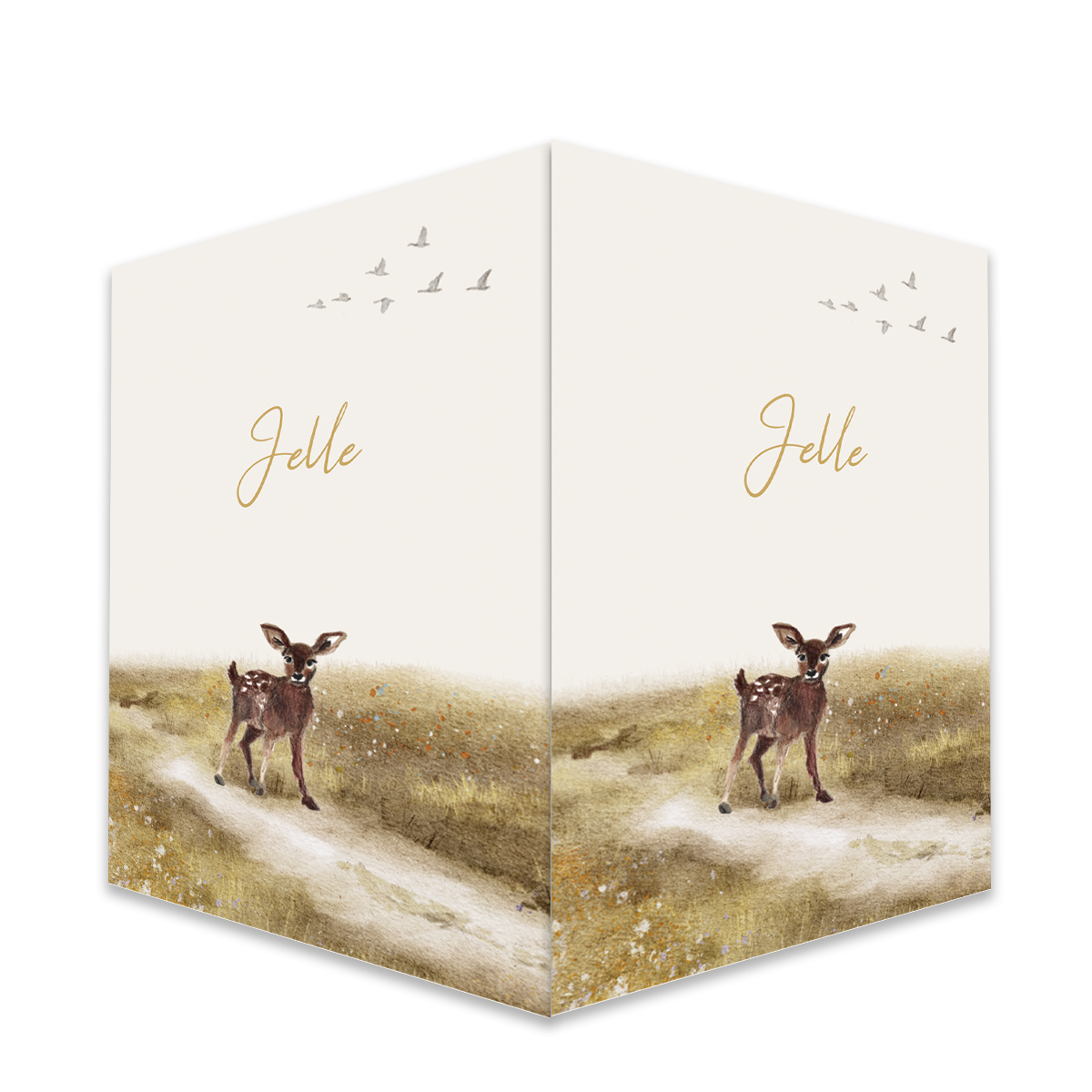Herfst raambord dubbel met een illustratie van een getekend hertje in een landschap. Je kunt het raambord zelf bewerken en aanpassen. Uniek geboortebord om de hele buurt te laten weten dat er een baby is geboren. Materiaal: Kanaalplaat | Formaat 40x60 cm | Weerbestendig | 3,5mm dik
