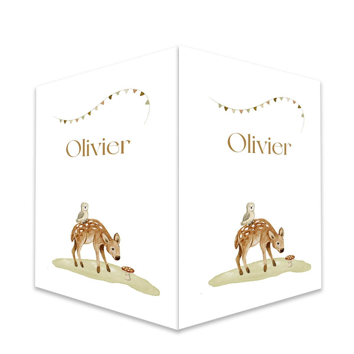 Dit raambord laat je hele buurt meegenieten van de geboorte van jullie kindje. Prachtig naambord met de naam van jullie kindje, en een prachtige illustratie van een hertje en een uil. De vrolijk gekleurde vlaggen maken er een feestje van. Dit dubbele bord plak je eenvoudig op het raam zoals een makelaarsbord.