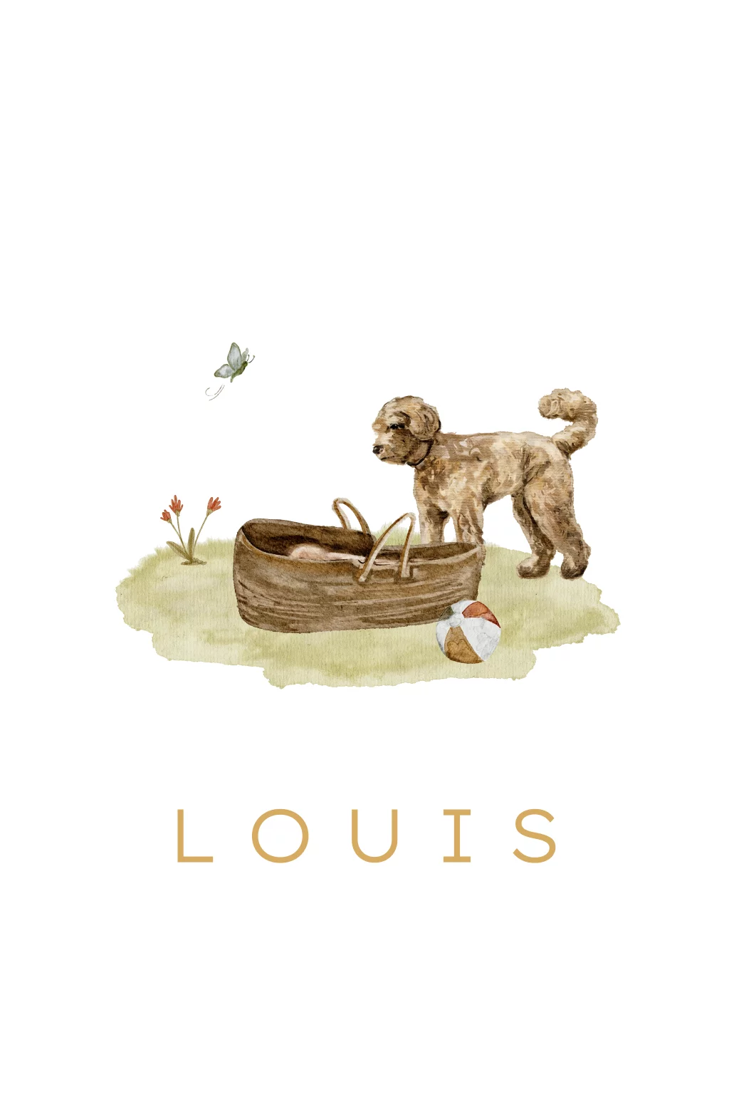 Prachtig en eenvoudig raambord voor geboorte. Op het bord staat een illustratie van een baby in een mandje, een labradoodle en een vlinder. Uniek geboortebord om de hele buurt te laten weten dat er een baby is geboren. Materiaal: Kanaalplaat | Formaat 40x60 cm | Weerbestendig | 3,5mm dik