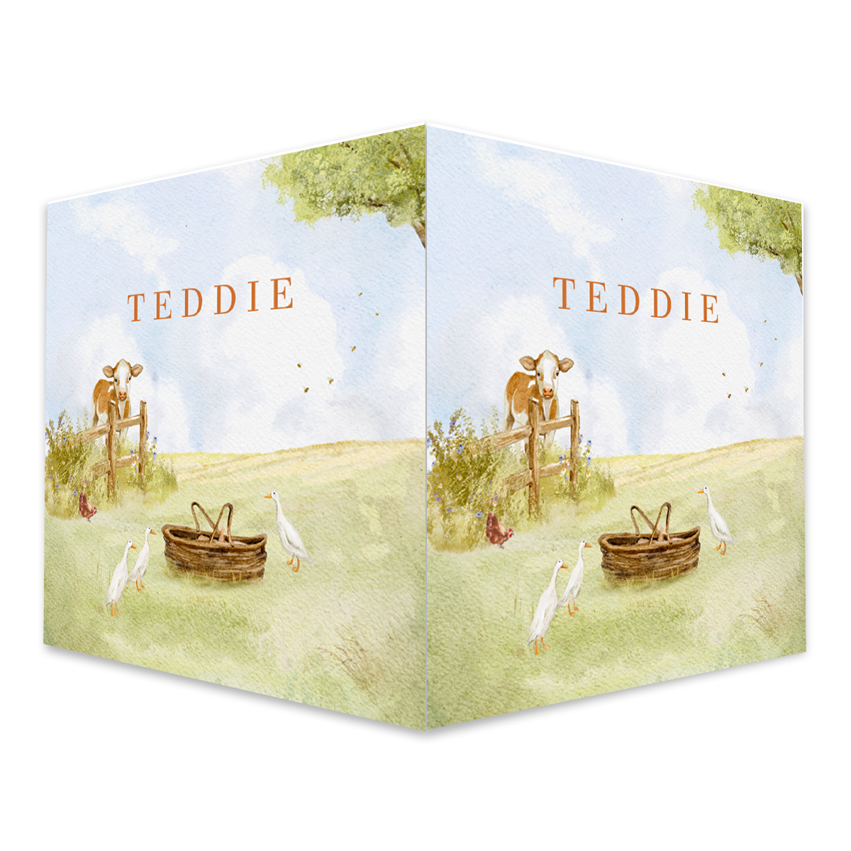 Laat iedereen weten dat jullie kleintje er is met dit prachtige dubbelzijdige raambord! Het getekende lenteontwerp met een schattig kalfje, speelse loopeenden en een babymandje straalt warmte en vreugde uit. Een stijlvolle en unieke manier om de geboorte van jullie kindje aan te kondigen.