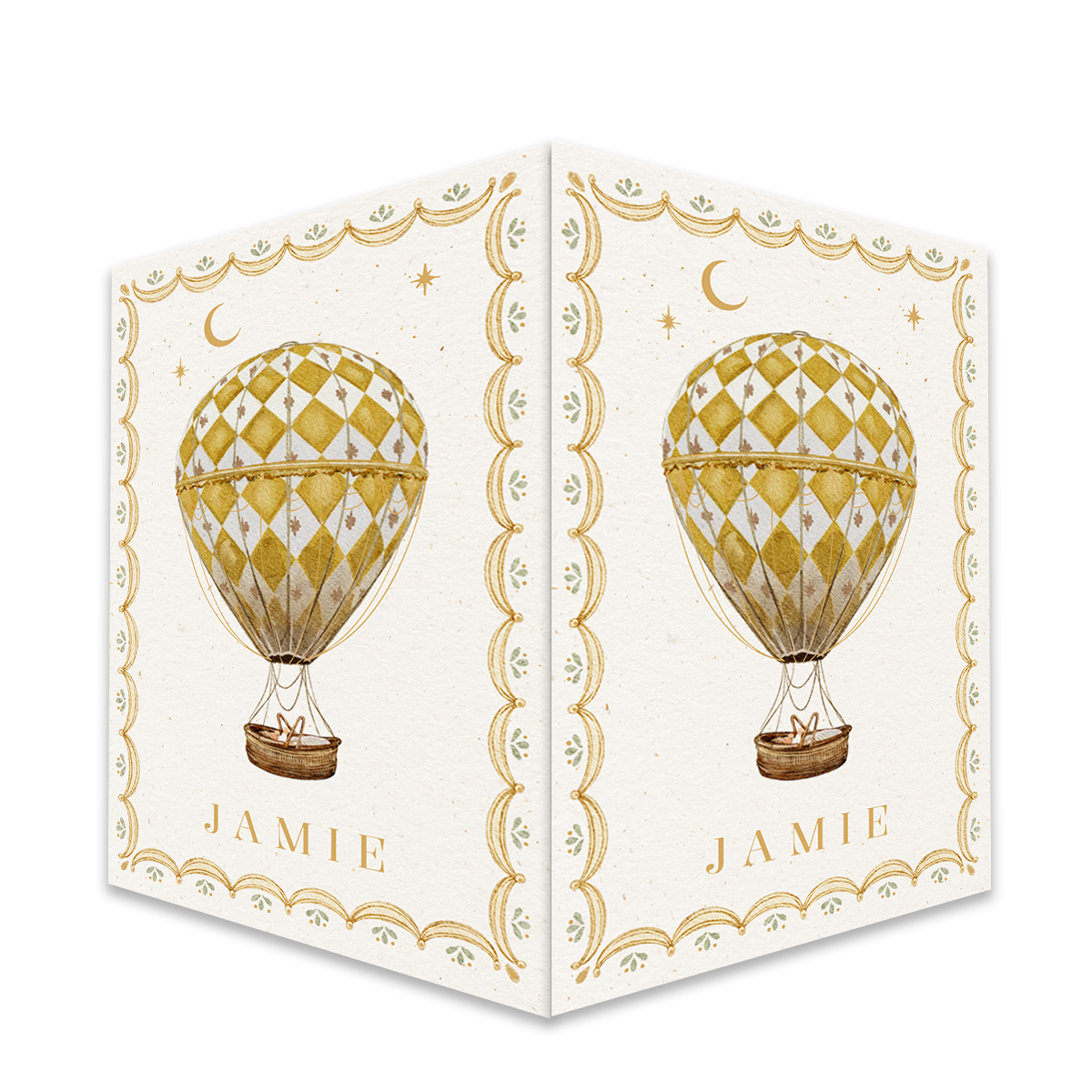 Dit prachtige raambord is een perfecte manier om aan iedereen in de buurt te laten zien dat jullie gezinnetje is uitgebreid met een kleintje. Op een achtergrond van beige papier is een luchtballon getekend met gele vlakken, maan en sterren. Aan de buitenrand staat een getekende border met gele stipjes en groene kleuren. Dit raambord past goed bij onze geboortekaartjes uit deze collectie. Heb je hulp nodig bij jouw raambord voor geboorte, laat het ons weten!