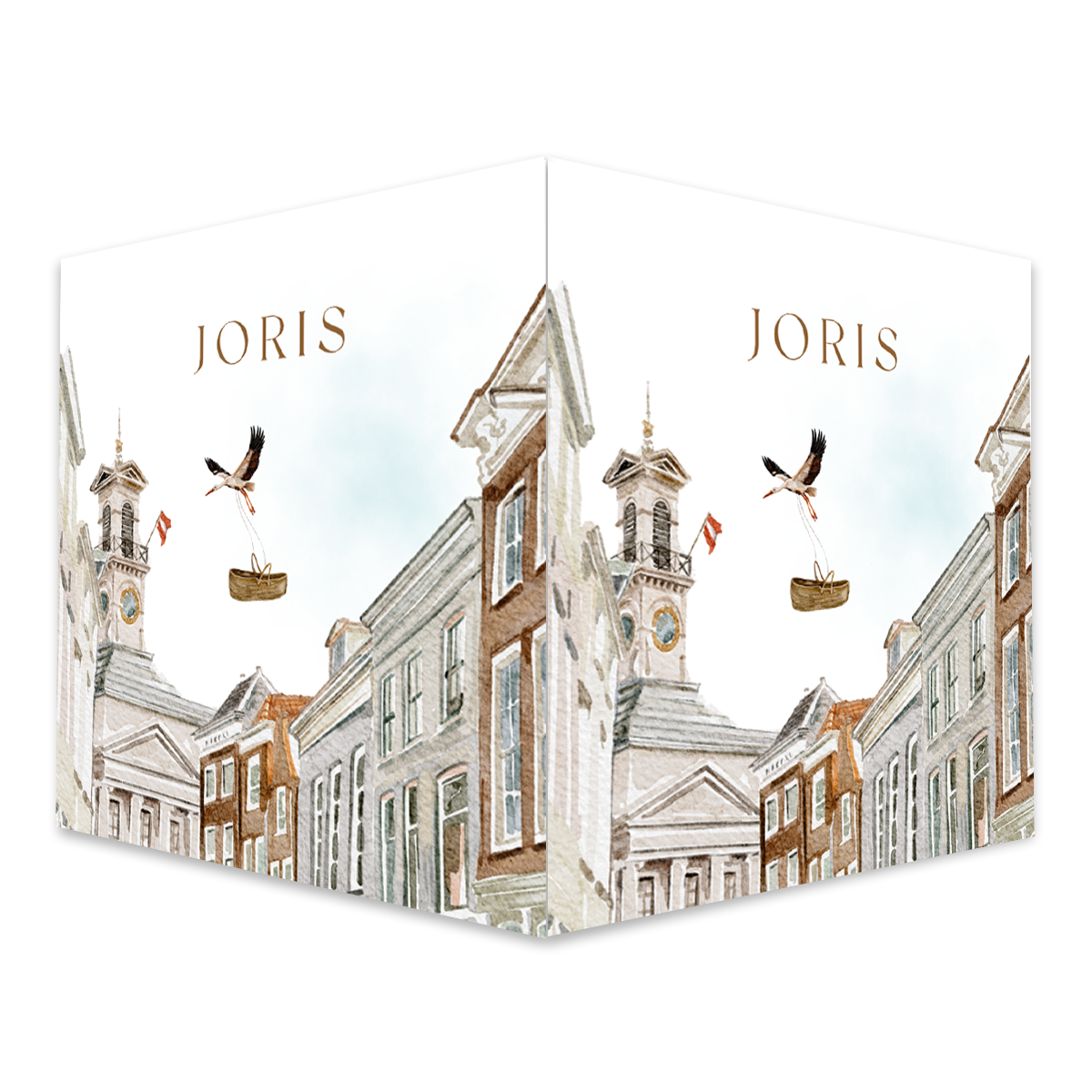 Dit raambord laat je hele buurt genieten van de geboorte van jullie kindje. Dit bord met een illustratie van een straat in Dordrecht met het gemeentehuis en een ooievaar. Je kunt dit bord zelf bewerken en aanpassen. Materiaal: Kanaalplaat | Formaat 50x50 cm | Weerbestendig | 3,5mm dik