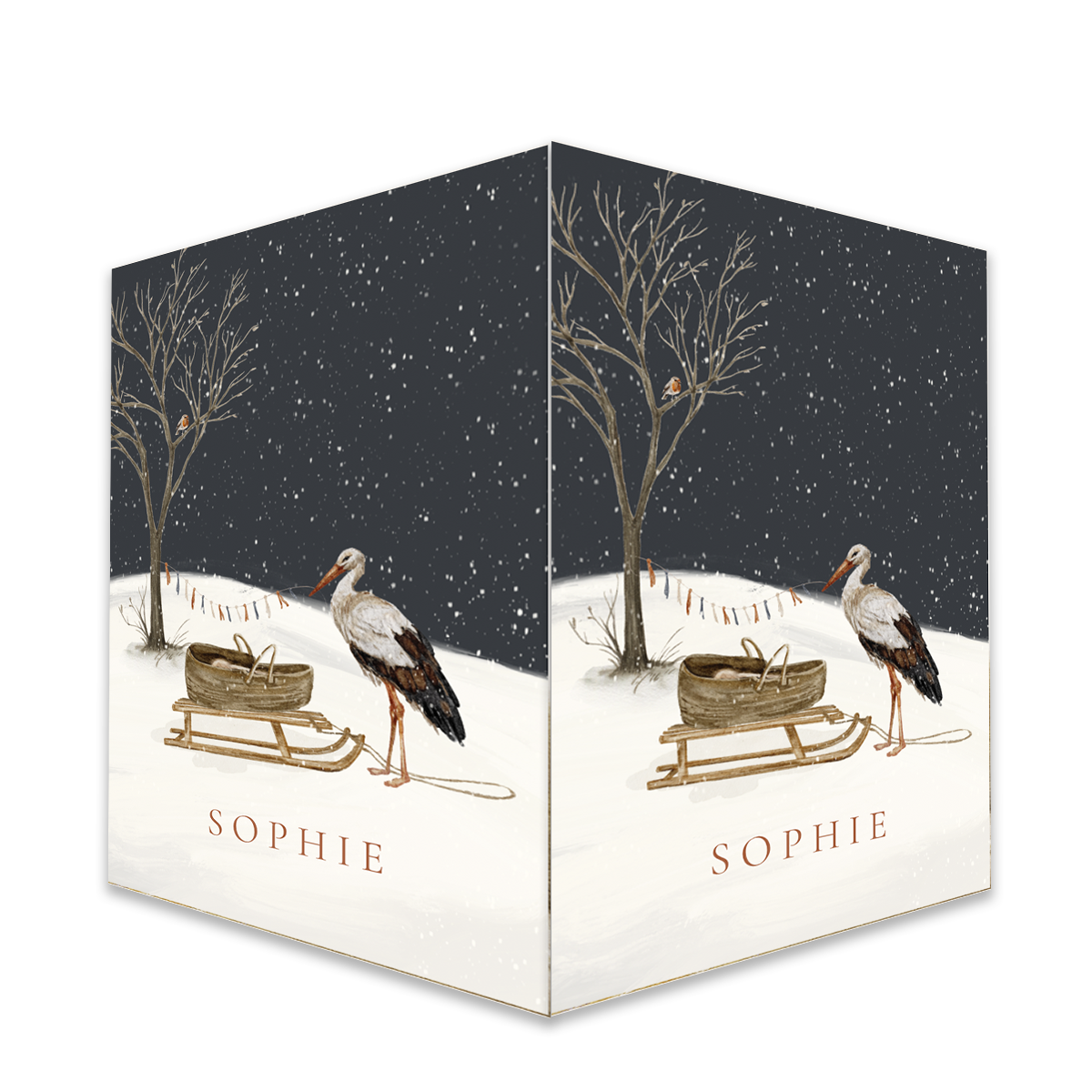 Prachtig winters raambord met een slee en daarnaast een ooievaar en een slinger. Je kunt het raambord zelf bewerken en aanpassen. Uniek geboortebord om de hele buurt te laten weten dat er een baby is geboren. Materiaal: Kanaalplaat | Formaat 40x60 cm | Weerbestendig | 3,5mm dik