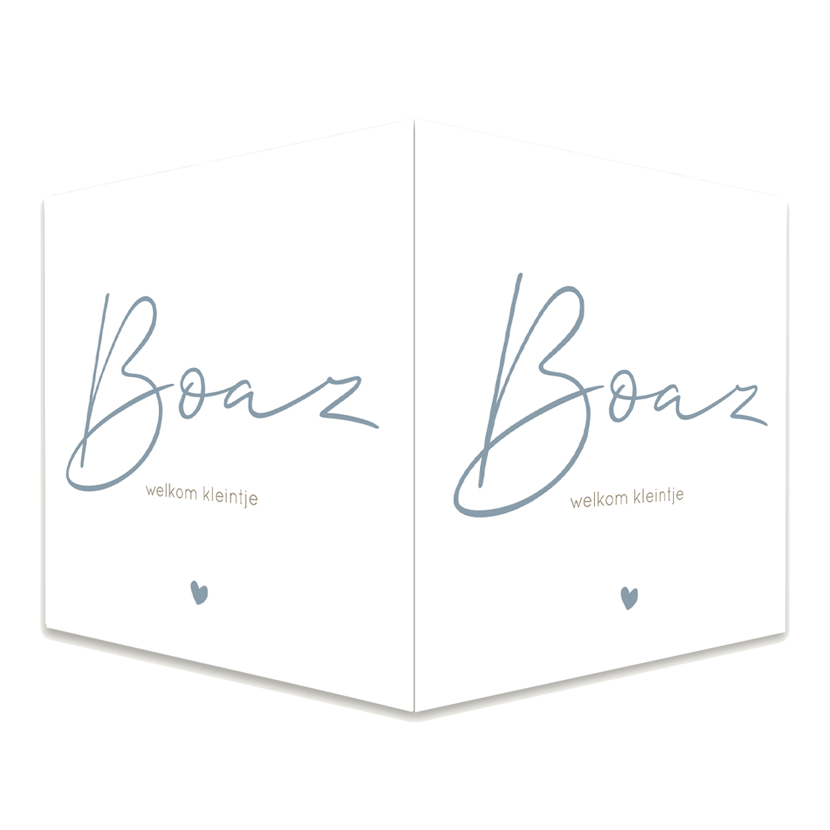 Vierkant dubbel raambord met de naam in een blauwe kleur. Daaronder staat welkom kleintje en onderaan een klein blauw hartje. Dit geboortebord kan je zelf helemaal aanpassen naar wens.