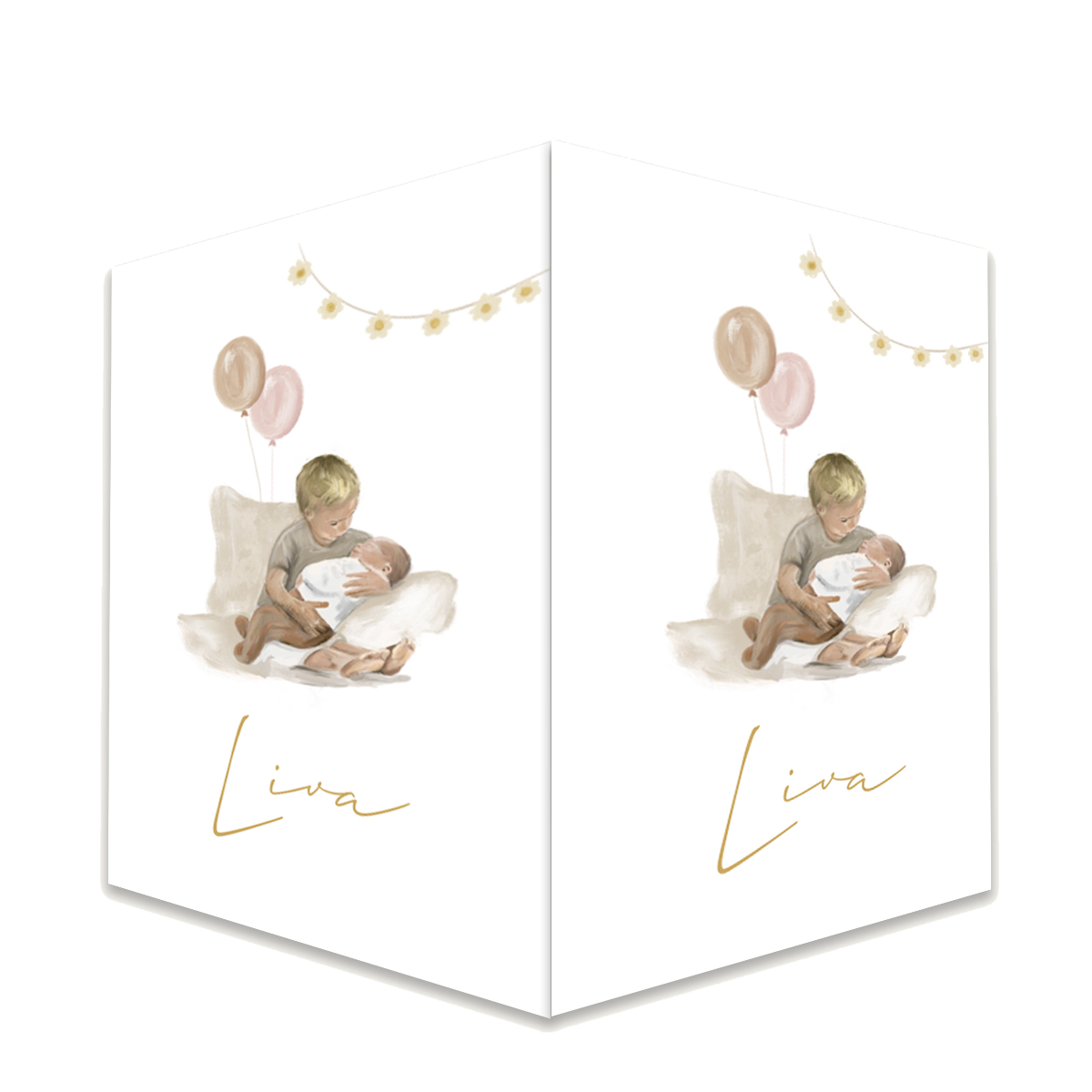 Prachtig raambord voor de geboorte van een zusje. De olieverf tekening van een broertje op de bank met een zusje op schoot is zo lief. De roze ballonnen en de slingers maken er echt een feestje van
