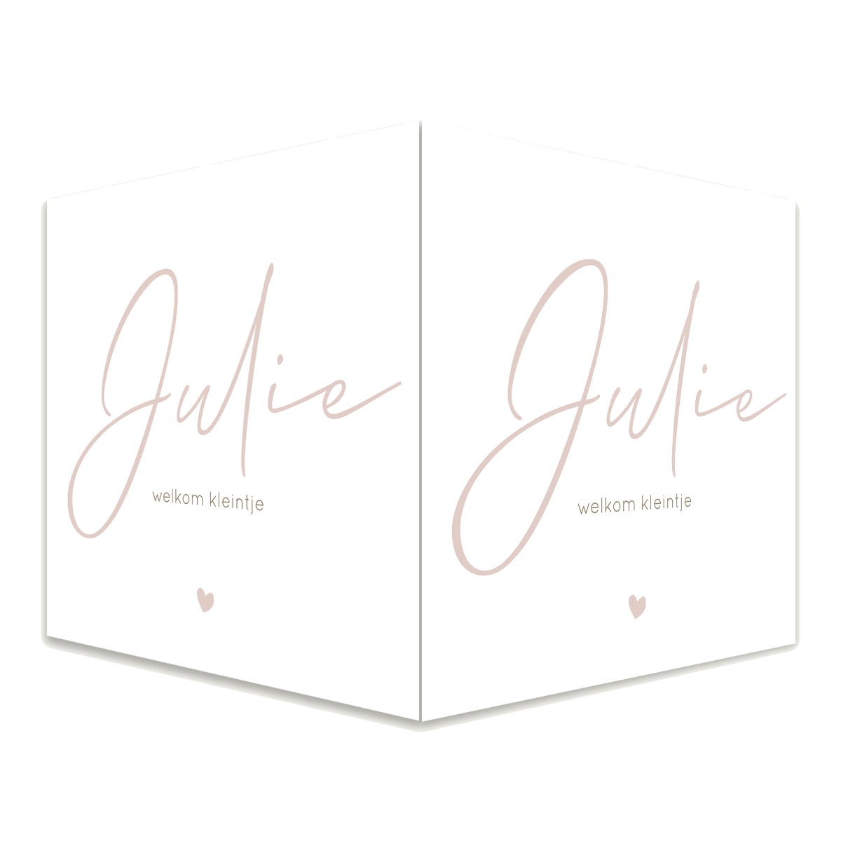 Vierkant dubbel raambord met de naam in een roze kleur. Daaronder staat welkom kleintje en onderaan een klein roze hartje. Dit geboortebord kan je zelf helemaal aanpassen naar wens.