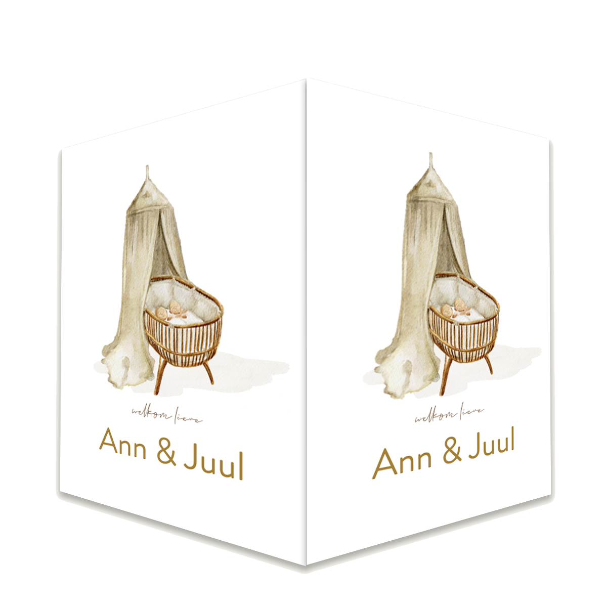 Prachtig en eenvoudig raambord voor geboorte van een tweeling. Op het bord staat een getekende wieg met een hemeltje twee kindjes erin Je kunt het raambord zelf bewerken en aanpassen. Uniek geboortebord om de hele buurt te laten weten dat er etwee baby's zijn geboren.