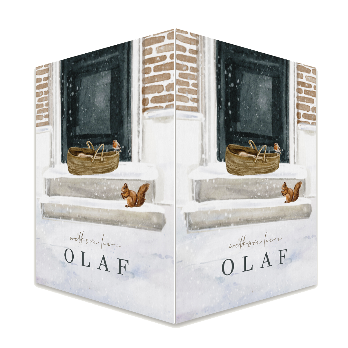 Raambord om de geboorte van jullie kindje ook aan de buurt bekend te maken. Dit dubbele raambord heeft een mooie illustratie van een voordeur met sneeuw en een baby in een mandje op de stoep.