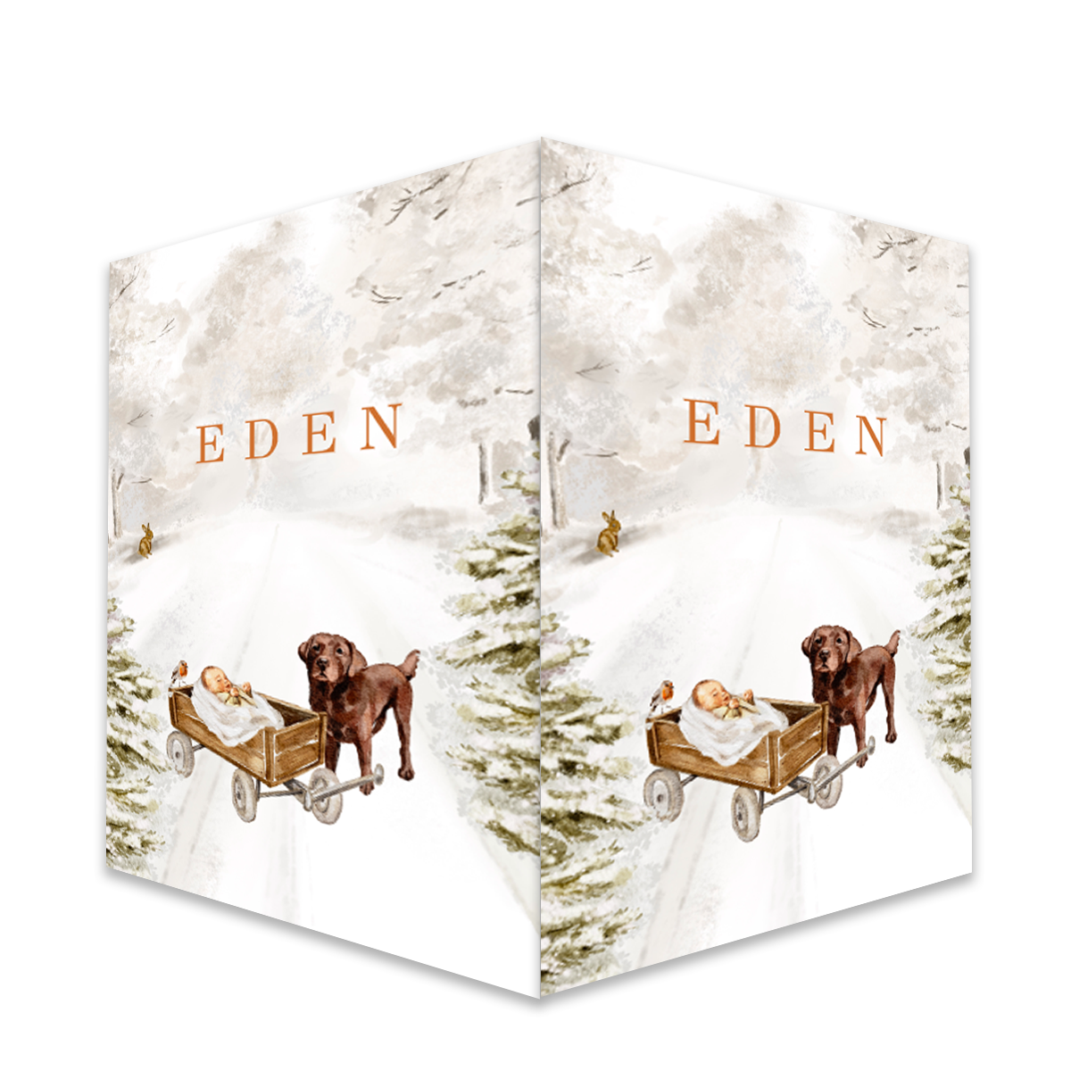 Dit prachtige raambord is een perfecte manier om aan iedereen in de buurt te laten zien dat jullie gezinnetje is uitgebreid met een kleintje. Op dit raambord staat een bolderkar met een lieve baby erin. De labrador en het konijntje maken dit winterkaartje helemaal af.