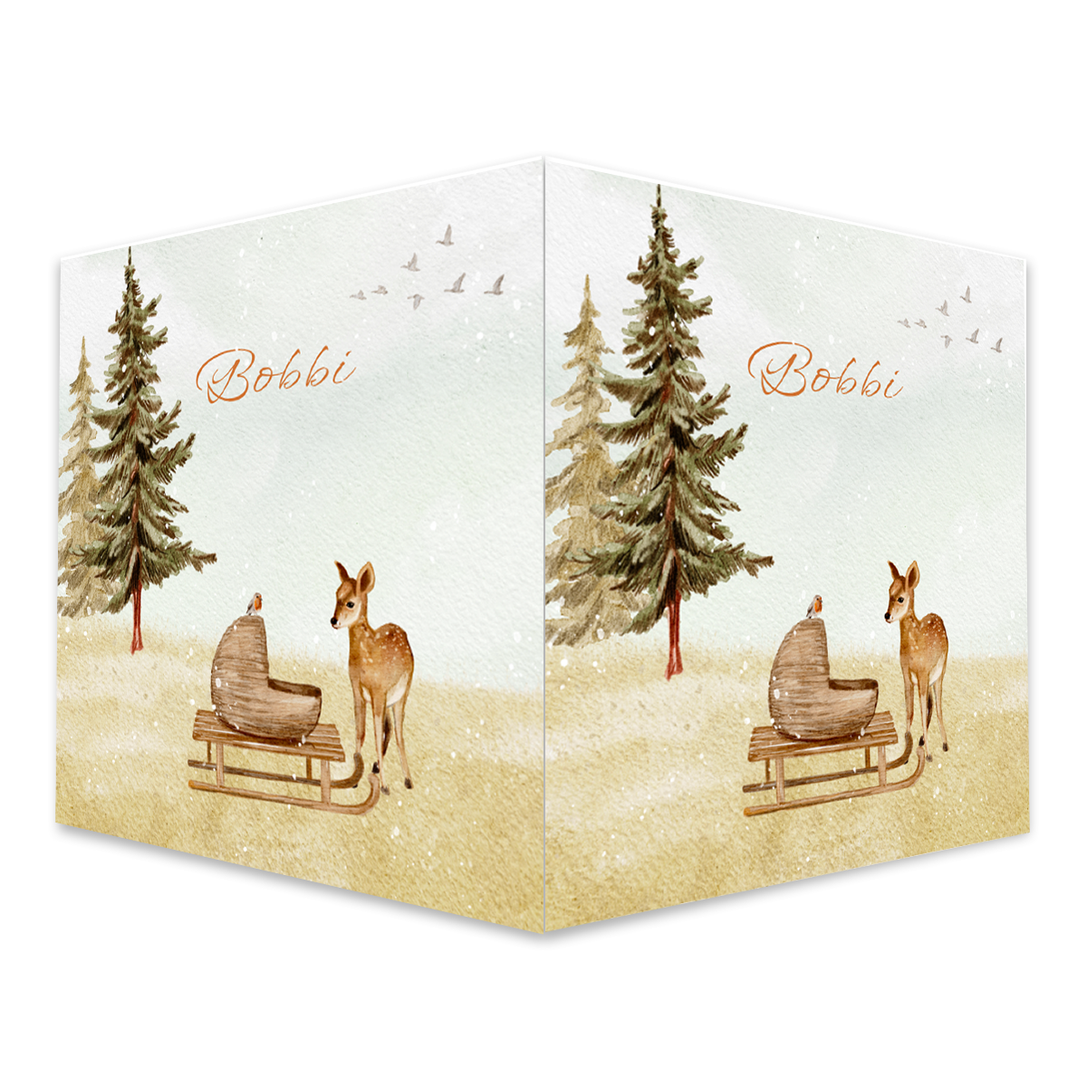 Dit prachtige raambord is een perfecte manier om aan iedereen in de buurt te laten zien dat jullie gezinnetje is uitgebreid met een kleintje. Op dit raambord staat een slee met daarop een babymandje. Het is een echt winters tafereel met de dennenboom en het hertje.