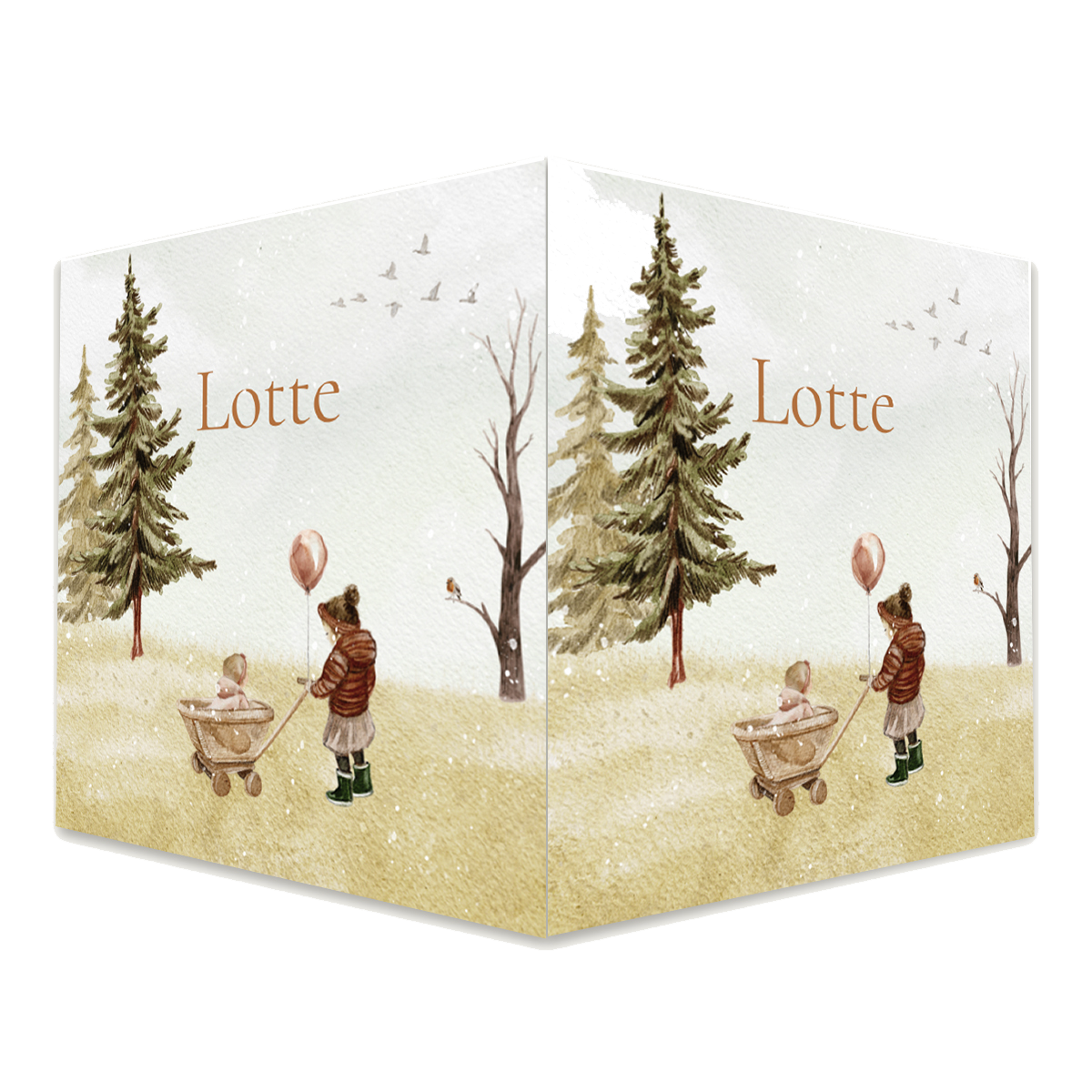 Dit prachtige raambord is een perfecte manier om aan iedereen in de buurt te laten zien dat jullie gezinnetje is uitgebreid met een kleintje. Op dit raambord staat een zusje met ballon bij een babyzusje in een bolderkar. Het is een tafereel in de winter met sneeuw en dennenbomen.