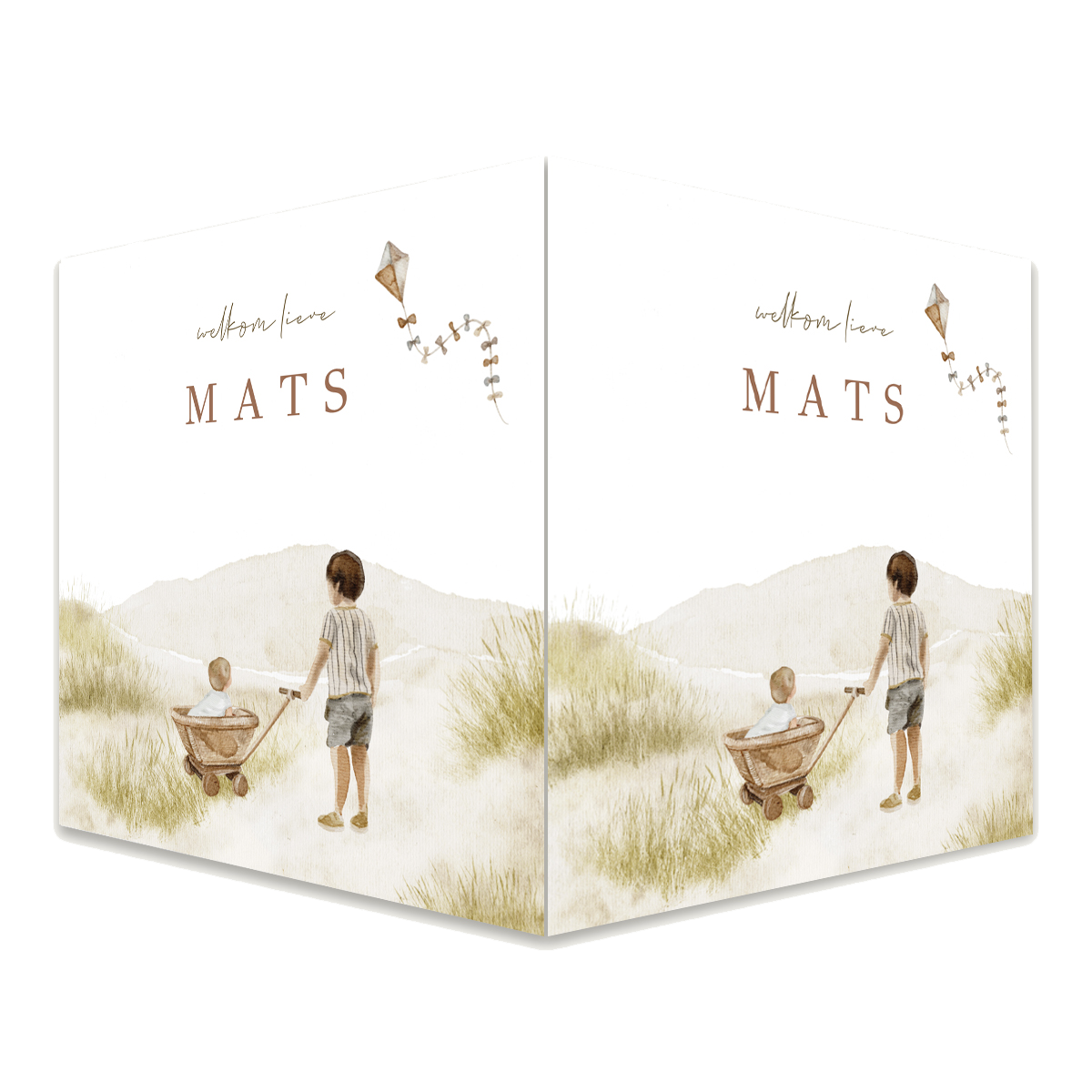 Laat de buurt weten dat er een kleintje bij jullie is geboren. Dit geboortebord heeft een illustratie van duinen en strand en een grote broer met een baby in een bolderkar. Uniek makelaarsbord voor een tweede kindje.