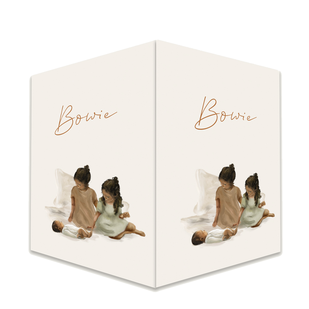 Dit prachtige raambord is een perfecte manier om aan iedereen in de buurt te laten zien dat jullie gezinnetje is uitgebreid met een kleintje. Op dit raambord staan twee grote zussen die trots kijken naar het kleine babyzusje. De kindjes hebben een donkere huidskleur.