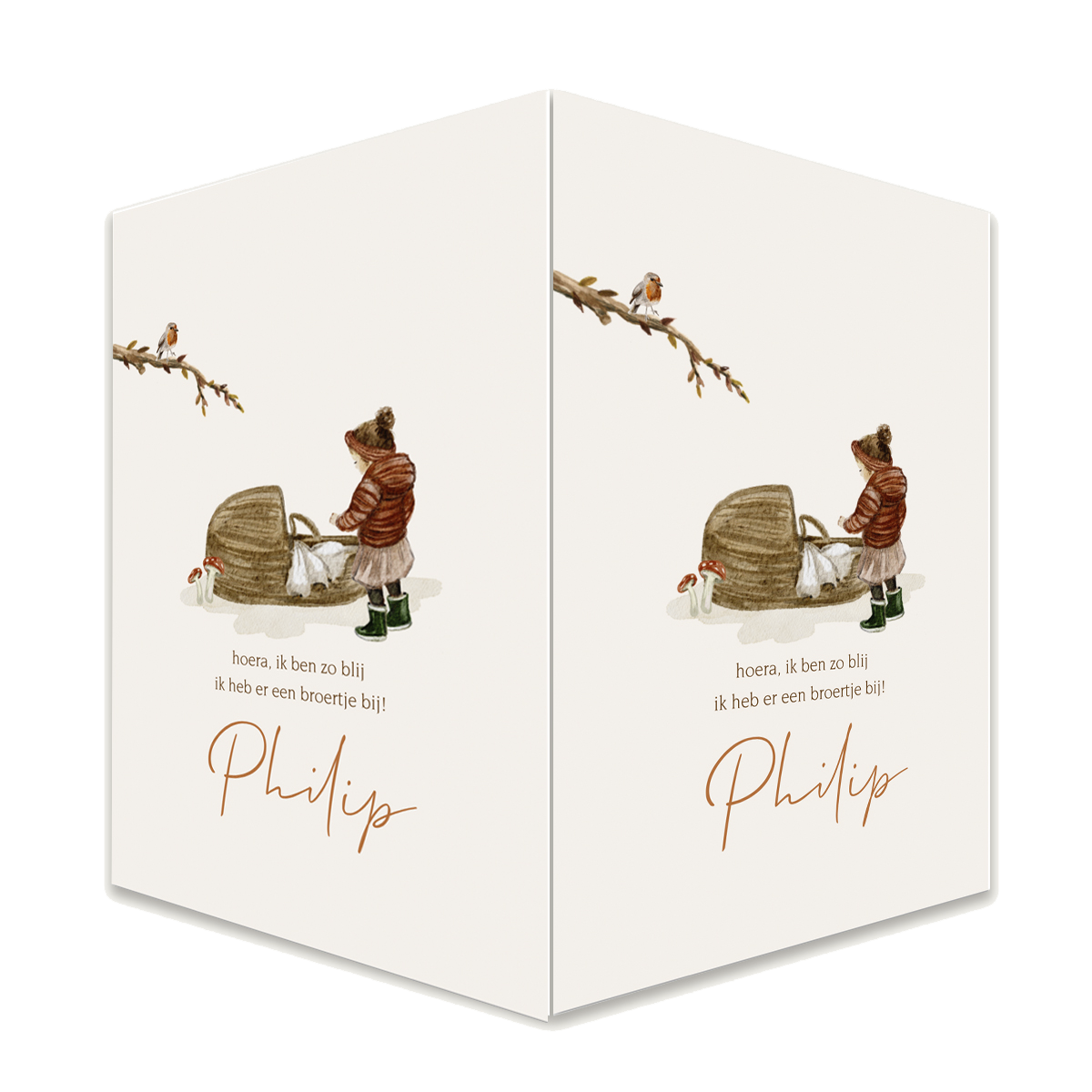 Raambord om de geboorte van jullie tweede kindje aan te kondigen. Op het geboortebord staat een baby mandje met paddestoelen en daarbij een ouder zusje. Je kunt dit raambord zelf bewerken en aanpassen.