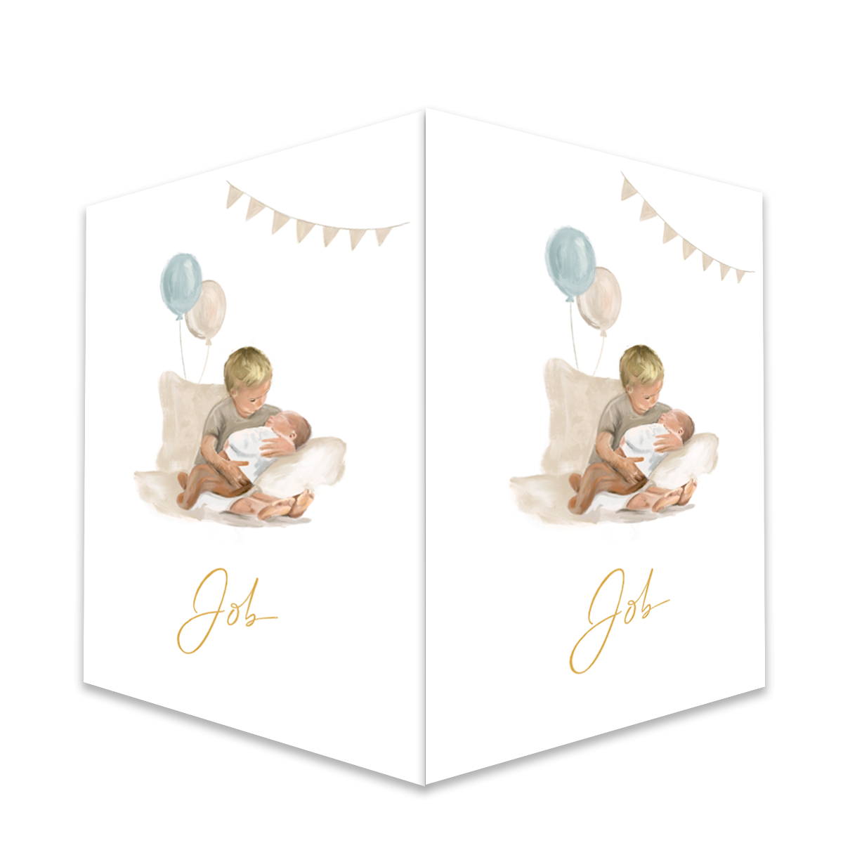 Raambord om de geboorte van jullie kindje ook aan de buurt bekend te maken. Dit dubbele geschilderde raambord heeft een mooie olieverf illustratie met een grote broer en een baby met twee ballonnen in het blauw. Materiaal: Kanaalplaat | Formaat 40x60 cm | Weerbestendig | 3,5mm dik