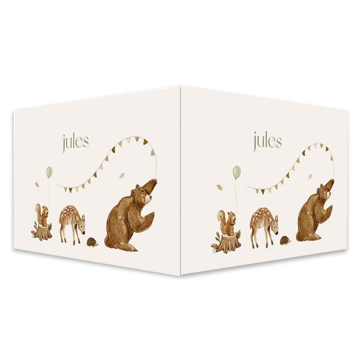 Dit raambord laat je hele buurt genieten van de geboorte van jullie kindje. Prachtig naambord met de naam van jullie kindje, een beer met vlaggen, een hertje en een eekhoorn met ballon.