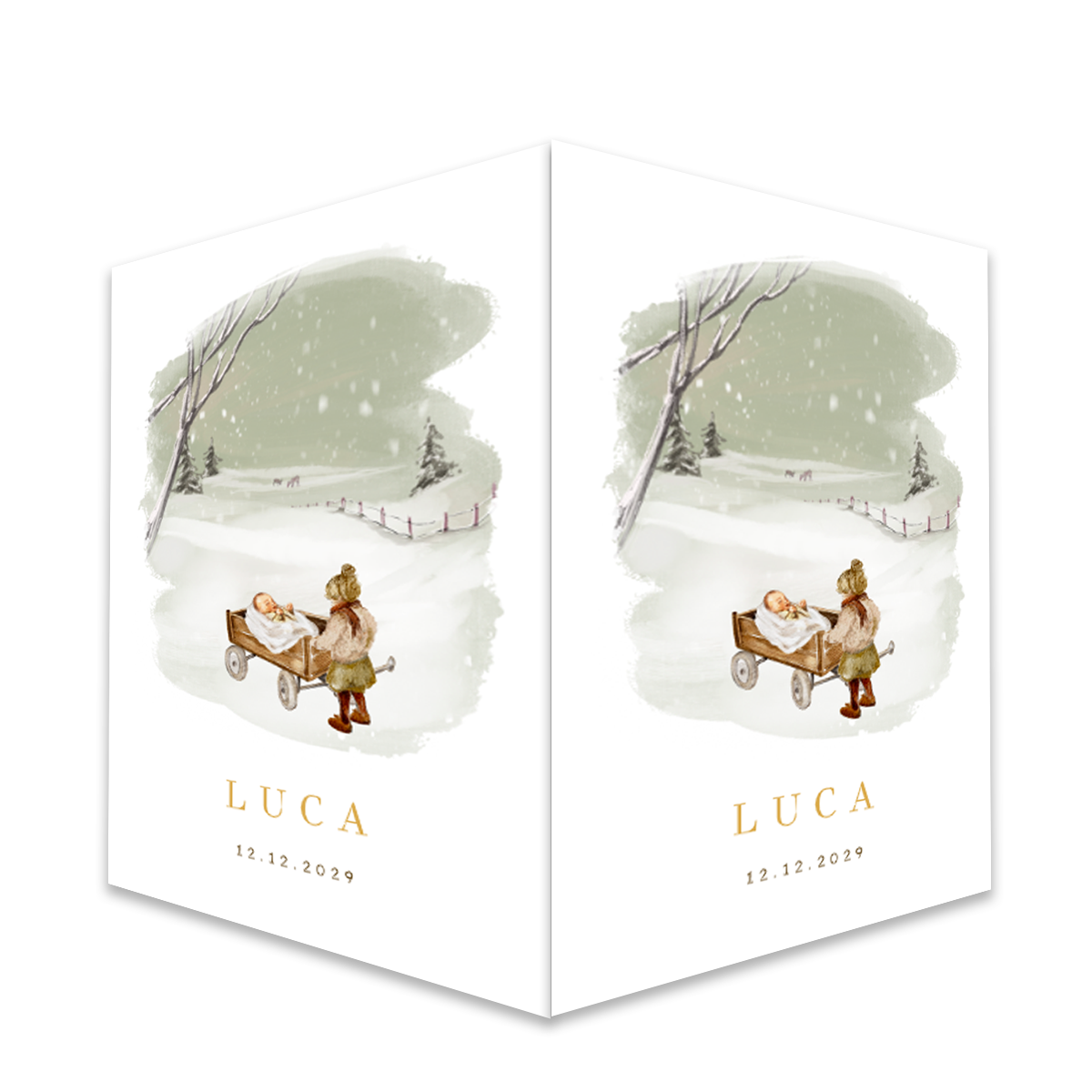 Raambord om de geboorte van jullie kindje ook in de buurt bekend te maken. Dit raambord in de vorm van een makelaarsbord heeft een winterse achtergrond met sneeuw. Op de voorgrond staat een bolderkar met een baby en daarbij een klein zusje. Je kunt dit raambord zelf aanpassen.