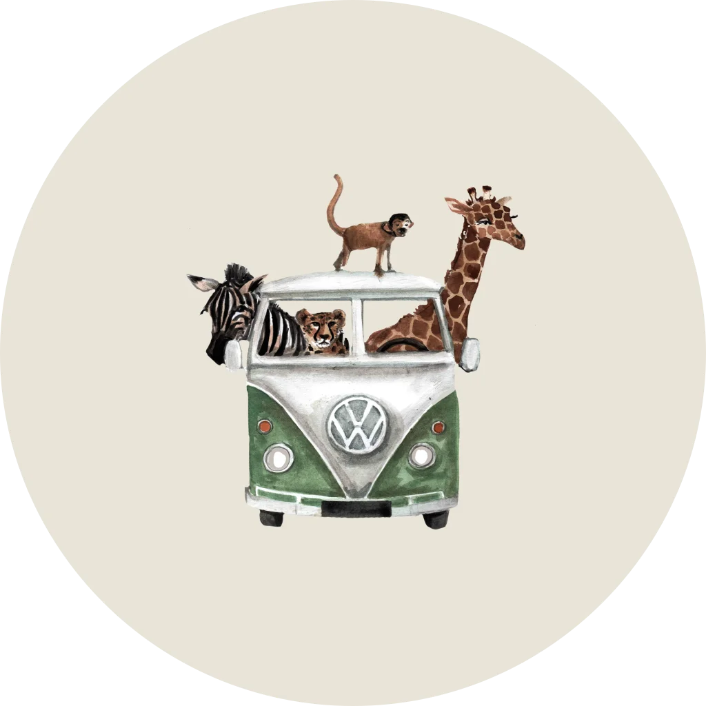 Vrolijke sticker met een bus vol jungledieren. Deze sticker kan je zelf personaliseren door een eigen naam naar keuze toe te voegen.