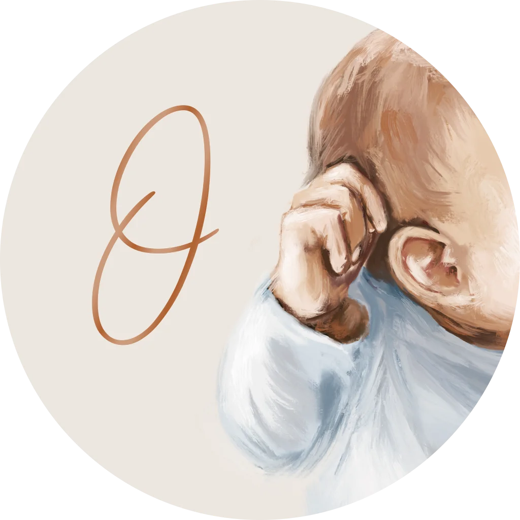 Elegante sluitsticker met de initiaal van jullie kindje en een babyjongen in olieverf-look. Handgeschilderde uitstraling, perfect bij geboortekaartjes met een klassieke of artistieke stijl. Een stijlvol detail voor geboortepost of doopsuikers.