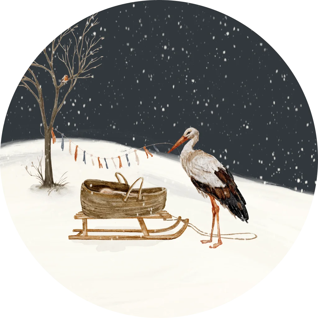 Leuke getekende sluitsticker in een winter stijl met een slee en een ooievaar met een slinger Ook leuk bij een traktatie.