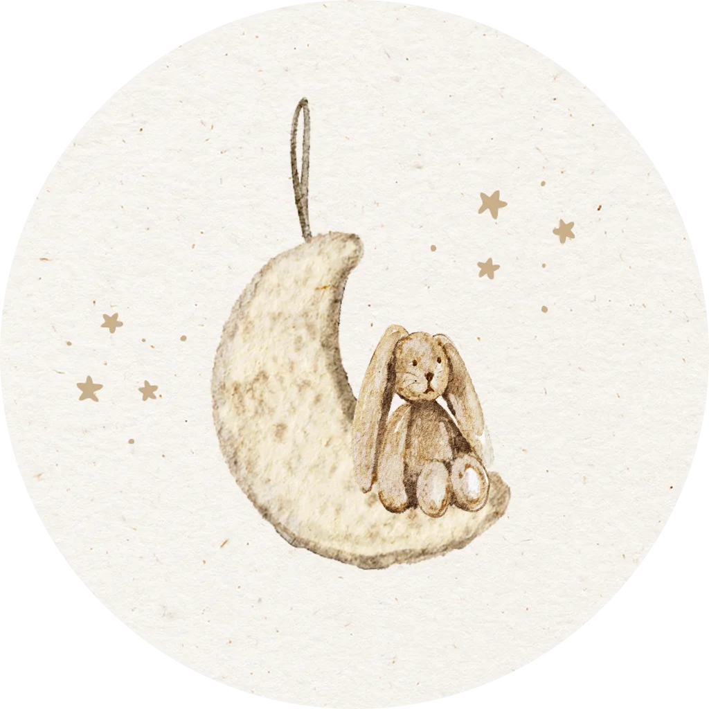 Een lieve, neutrale sluitsticker die perfect past bij een geboortekaartje voor een jongen of meisje. Op de beige achtergrond staat een schattig konijntje op een maan, omringd door kleine sterretjes. Deze sluitsticker geeft je envelop een dromerige en verzorgde uitstraling — de perfecte finishing touch voor jullie geboortepost! Combineer de sticker met het bijpassende geboortekaartje voor een prachtig geheel.