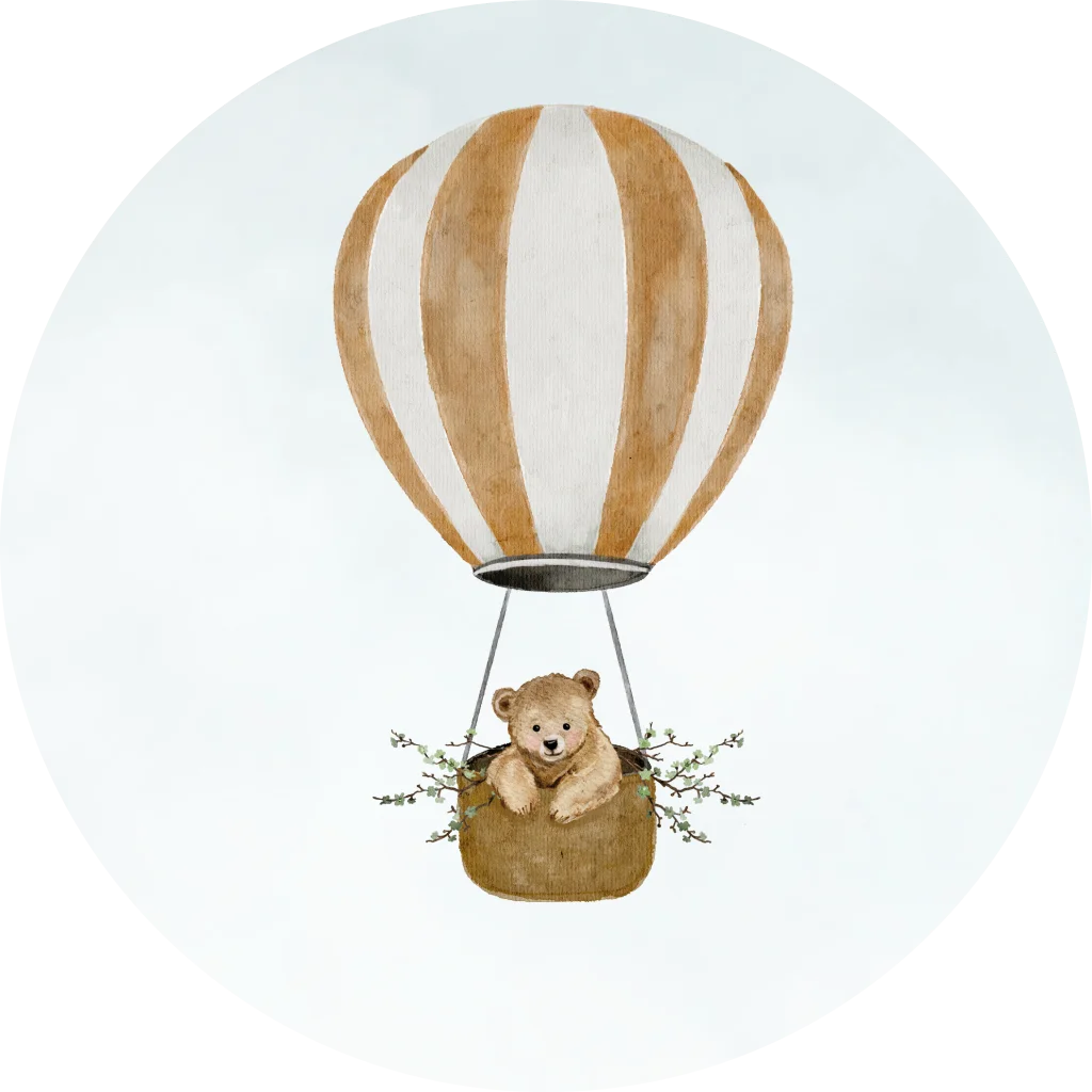 Sluitsticker met een verfijnde aquarelillustratie van een beertje in een oranje luchtballon in een wolken lucht. Perfect voor het stijlvol afsluiten van enveloppen. Past perfect bij het geboortekaartje van deze serie.