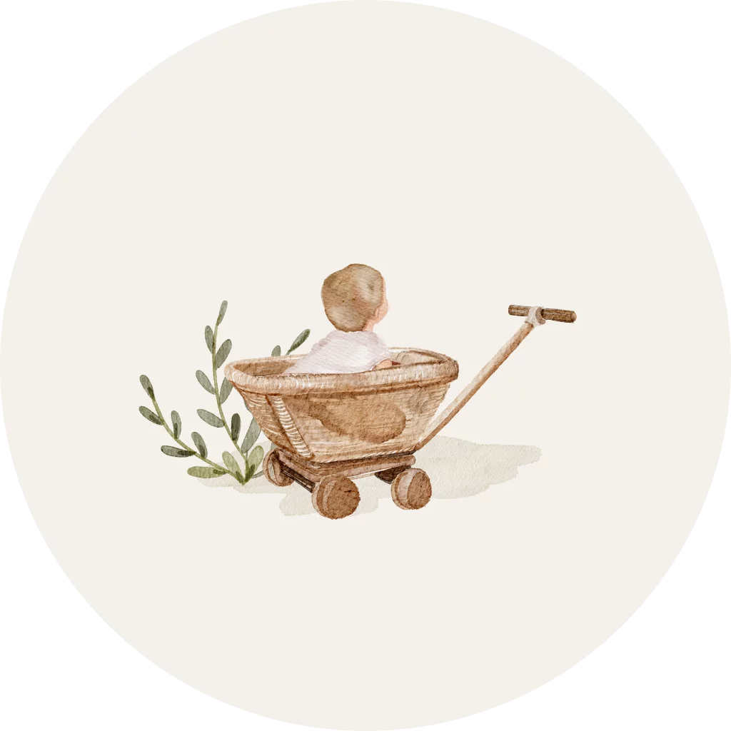 Sluitsticker met baby meisje in een bolderkar met roze romper