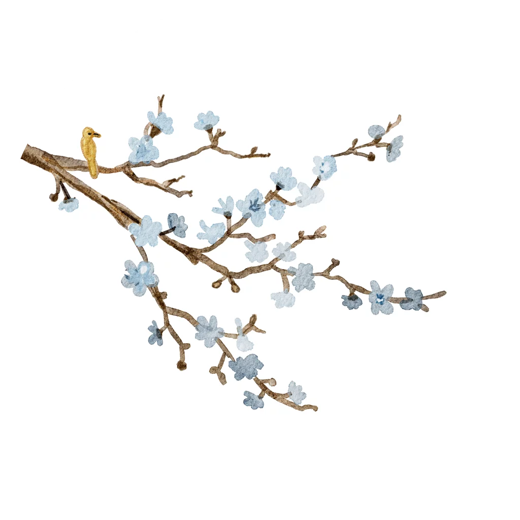 Vrolijke sluitsticker voor een lente of zomer geboortekaartje. Op de sticker staat een bloesemtak in blauwe kleur.