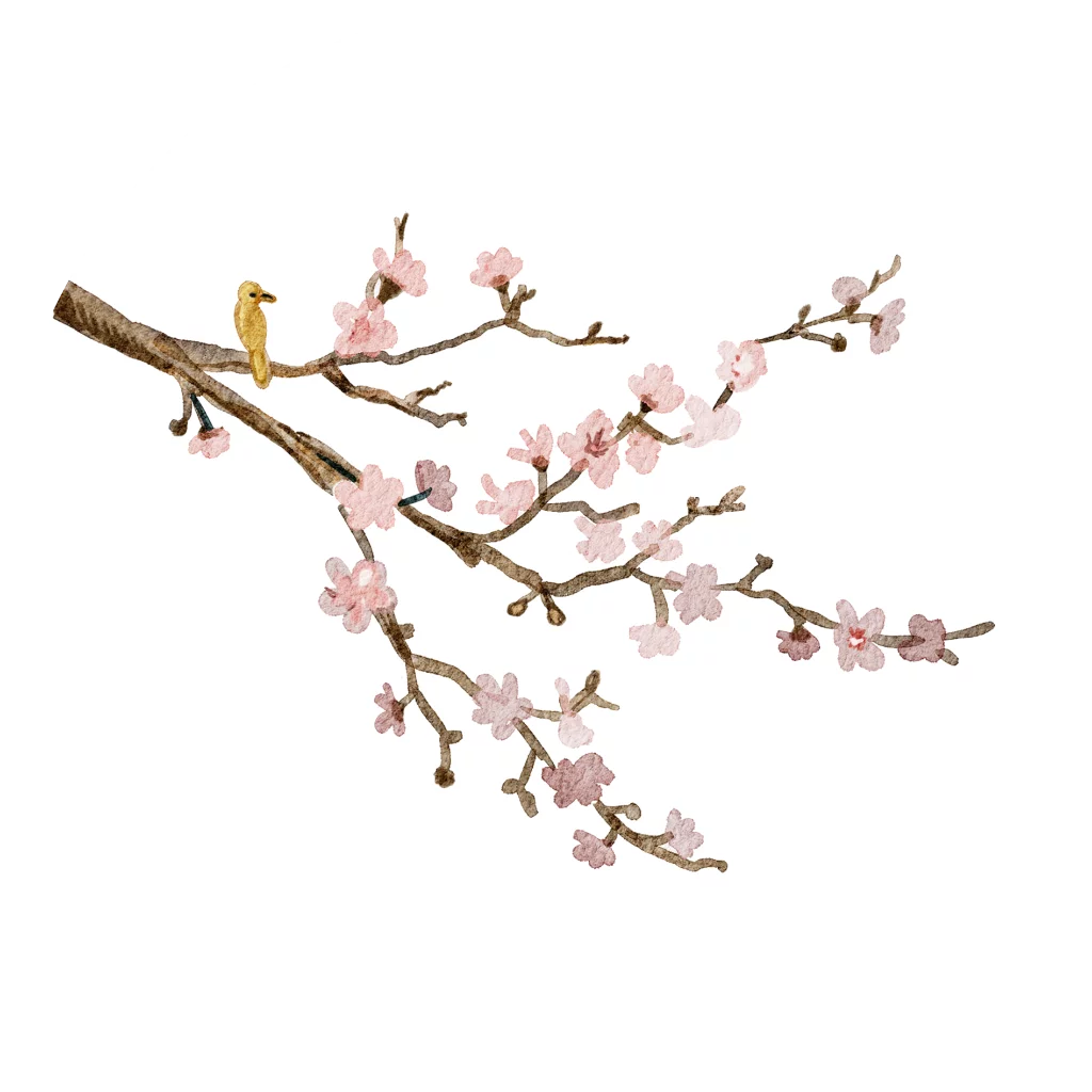 Vrolijke sluitsticker voor een lente of zomer geboortekaartje. Op de sticker staat een bloesemtak in roze kleur.