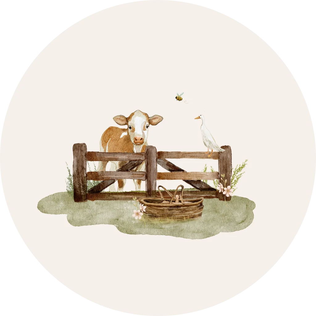 Geef je geboortekaartje of traktatie een speels accent met deze sluitsticker in boerderijthema. Het ontwerp toont een baby meisje met een koe in een fris lentelandschap. Ideaal voor geboortekaartjes met een landelijke of dierenthema. Combineer met bijpassende kaartje en extra bij-producten voor een mooi geheel.