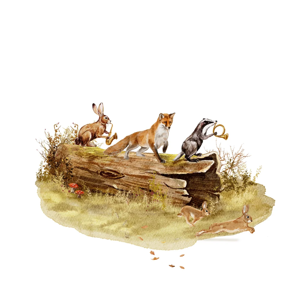 Sluitsticker voor bij je geboortekaartje met een illustratie van een boomstam, een konijn, een vos en een das. Ook leuk voor bij een traktatie.