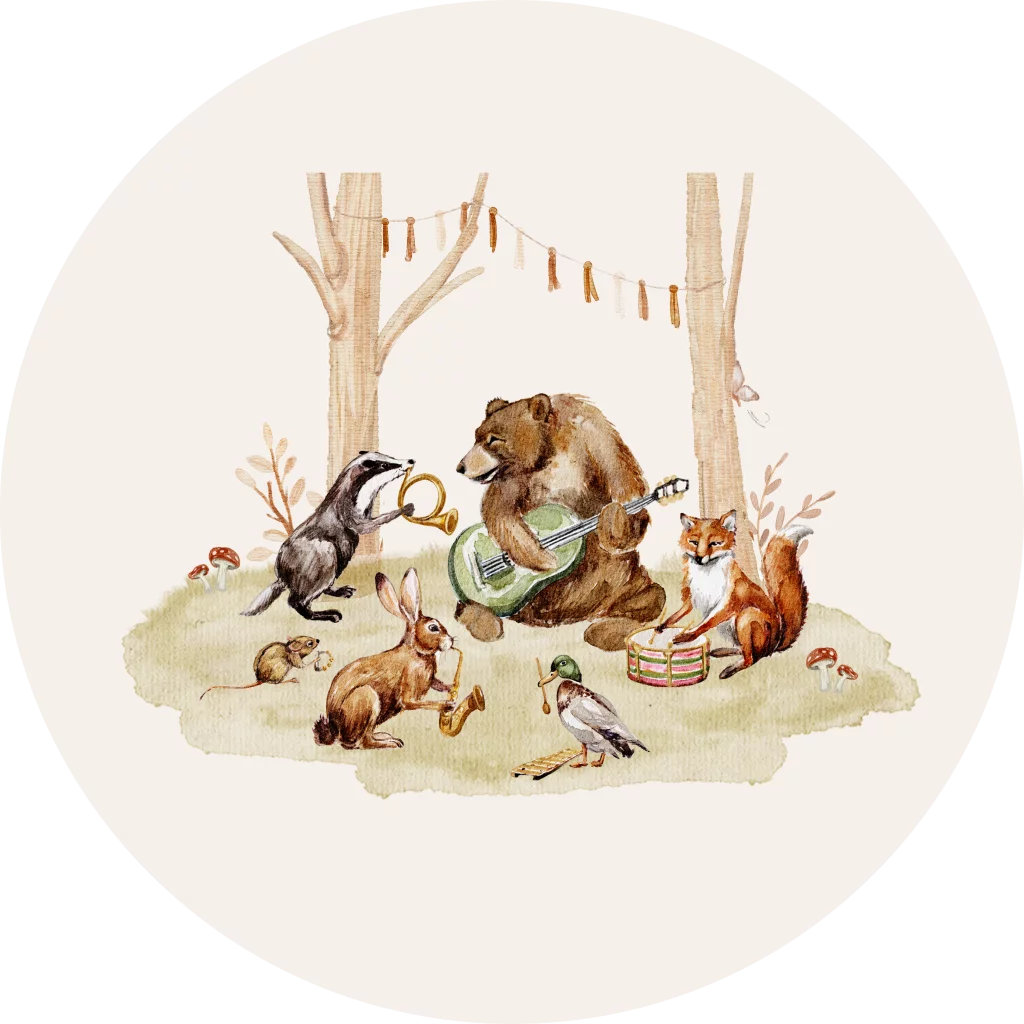 Prachtige getekende sluitsticker van een feestje in het bos met bosdieren. Ieder dier heeft een muziek instrument.